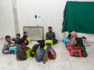 Salah seorang pengajar, Ustaz Bagus, menjelaskan materi yang diajarkan cukup beragam. “Adapun materi kami di antaranya membaca Al-Qur’an, menyalin Al-Qur’an, serta membaca dan menyalin huruf Iqra,” jelasnya.
