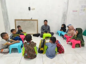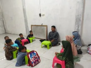Salah seorang pengajar, Ustaz Bagus, menjelaskan materi yang diajarkan cukup beragam. “Adapun materi kami di antaranya membaca Al-Qur’an, menyalin Al-Qur’an, serta membaca dan menyalin huruf Iqra,” jelasnya.