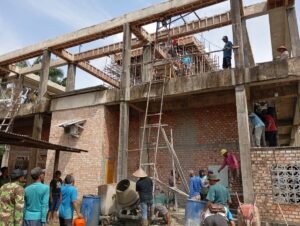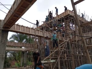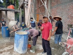 Tidak sekadar menyampaikan sambutan, kepala desa terlihat turun ke lapangan, berbaur, dan ikut serta mengerahkan tenaga dalam proses estafet pengecoran material kubah masjid.