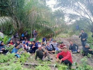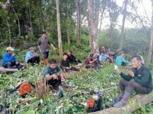 Ir. Saikun, salah satu koordinator kegiatan, menjelaskan target pekerjaan. “Kita menargetkan penebangan pohon karet selesai hingga sore hari, sehingga lahan bisa segera dipancang dan ditanami sawit,” ujarnya.